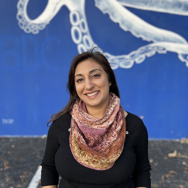 Serena of The Crafty Crochetier is modeling her Crossroads Shawl.